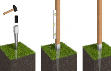 - Coloca los postes de la pérgola en las bases de fijación y asegúralos firmemente con los tornillos suministrados. Verifica la verticalidad de los postes con un nivel para garantizar la estabilidad de la estructura.